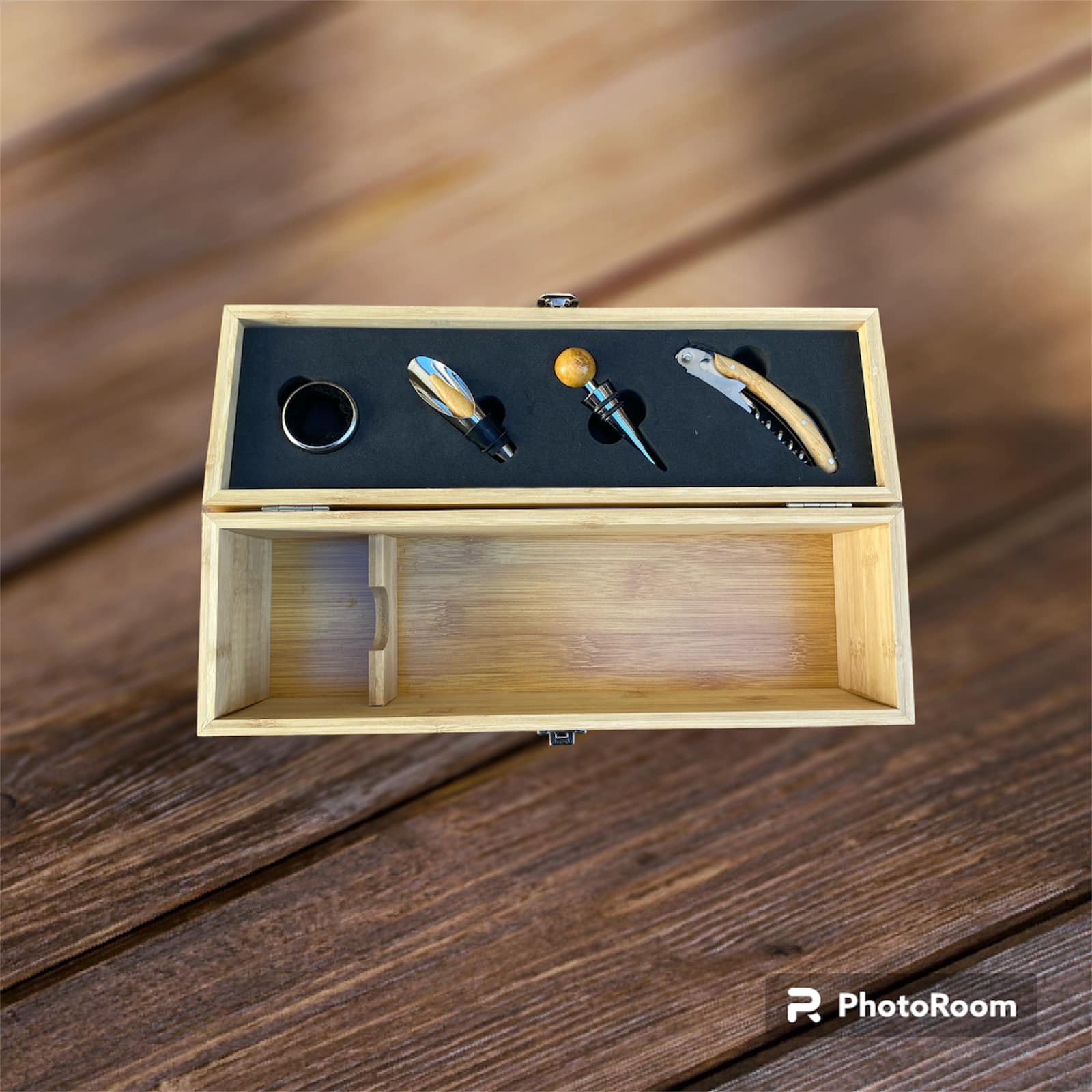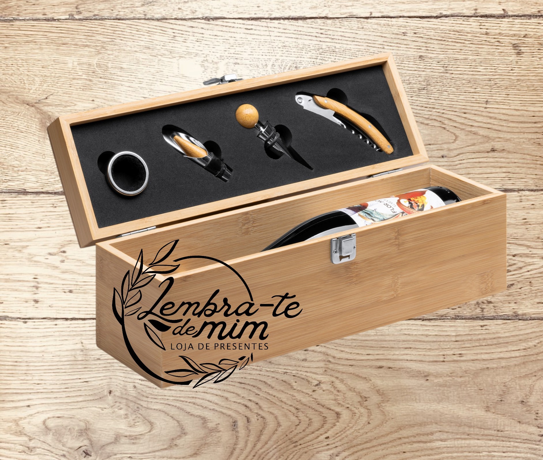 Caixa de bambu para garrafa de vinho com acessórios
